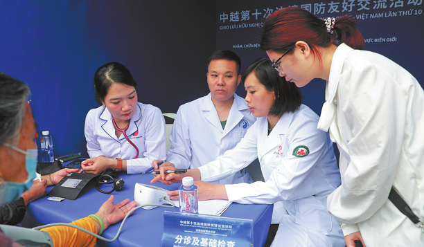 Военни лекари от Китай и Виетнам си сътрудничат, за да оценят здравето на пациента във вторник по време на доброволни медицински консултации в Dongxing, автономния регион Guangxi Zhuang. Четиричасовият лагер се проведе както в Dongxing, така и в провинция Куанг Нин във Виетнам. ZHANG ZIYI/ЗА КИТАЙ ДАЙЛИ