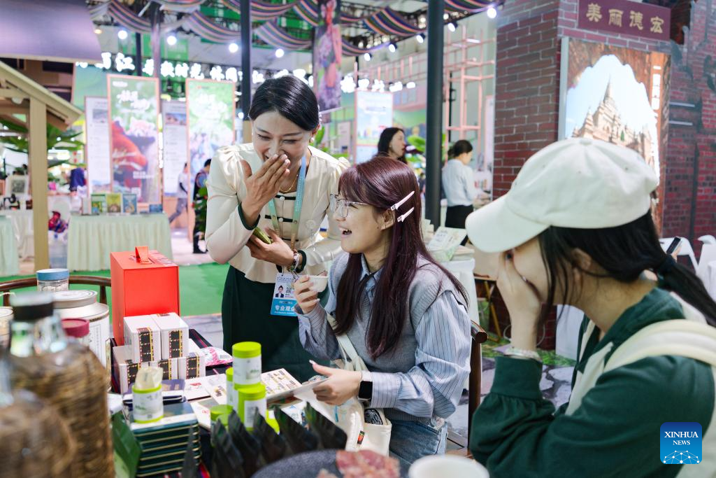 Посетителите опитват чаени продукти в изложбена зона, включваща „Sojourning in Yunnan“ на 9-тото Експо Азия в Китай-Юг в Кунмин, югозападен Китай „провинция Юнан, 20 юни 2025 г. [Photo/Xinhua]