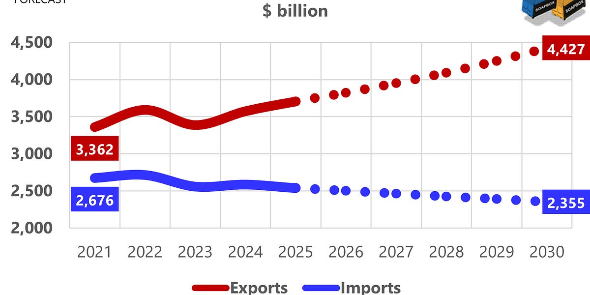 Четвъртият пленум, определящ рамката за петгодишния план 2026–2030 г., сигнализира за позиция на първо място за сигурността, тежка замяна и не казва много за отварянето на пазарите. Този фон сочи към десетилетие на излишък от крепости. Ръстът на износа е скромен, около 3,1% годишно, докато напрежението в чужбина продължава да нараства. Вносът се свива по подразбиране и по план, намалявайки с 1,4% годишно: слабото вътрешно потребление ограничава търсенето, а воденото от политиката заместване на вноса пренасочва поръчките към местни доставчици.