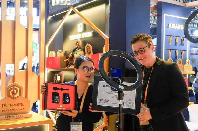 Изложителите провеждат събитие за поточно предаване на живо на щанда на новозеландска марка мед в изложбената зона за храни и селскостопански продукти по време на осмото Китайско международно изложение за внос (CIIE) в Шанхай в Източен Китай на 6 ноември 2025 г. [Photo/Xinhua]