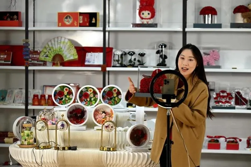 Член на персонала популяризира продукти чрез поточно предаване на живо в индустриална демонстрационна база за култура и туризъм в град Шидзяджуан, провинция Хъбей в Северен Китай, 11 ноември 2025 г. [Photo/Xinhua]