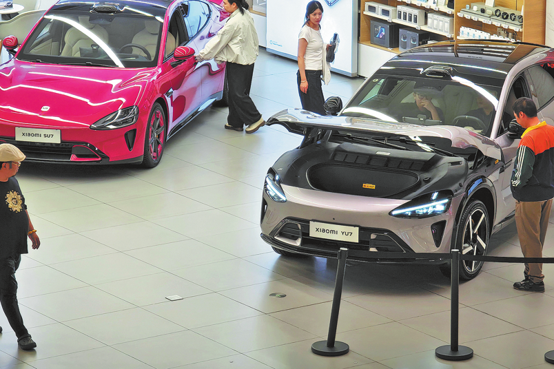Клиенти проверяват електрически превозни средства в магазин на Xiaomi в Кингдао, провинция Шандонг, на 15 октомври. TANG KE/ЗА КИТАЙ ДАЙЛИ