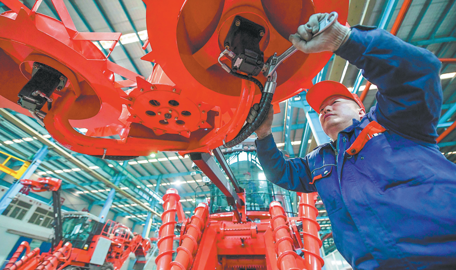 Служител работи на поточната линия на частен производител на комбайни за тръстика в Луоянг, провинция Хенан. ZHANG XIYI/ЗА КИТАЙ ДЕЙЛИ