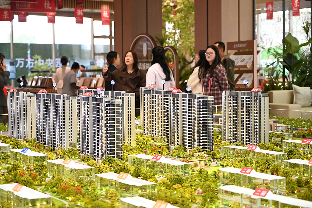 Потенциални купувачи на жилища разглеждат модел на имот в Хоххот, автономен регион Вътрешна Монголия, на 1 октомври 2025 г. [Photo/VCG]