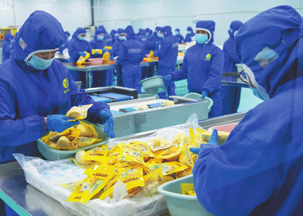 Хората работят в предприятие за преработка на дуриан в цялостната свързана зона Qinzhou в Qinzhou, автономен регион Guangxi Zhuang в Южен Китай, 6 януари. HOU CHAOBO/XINHUA